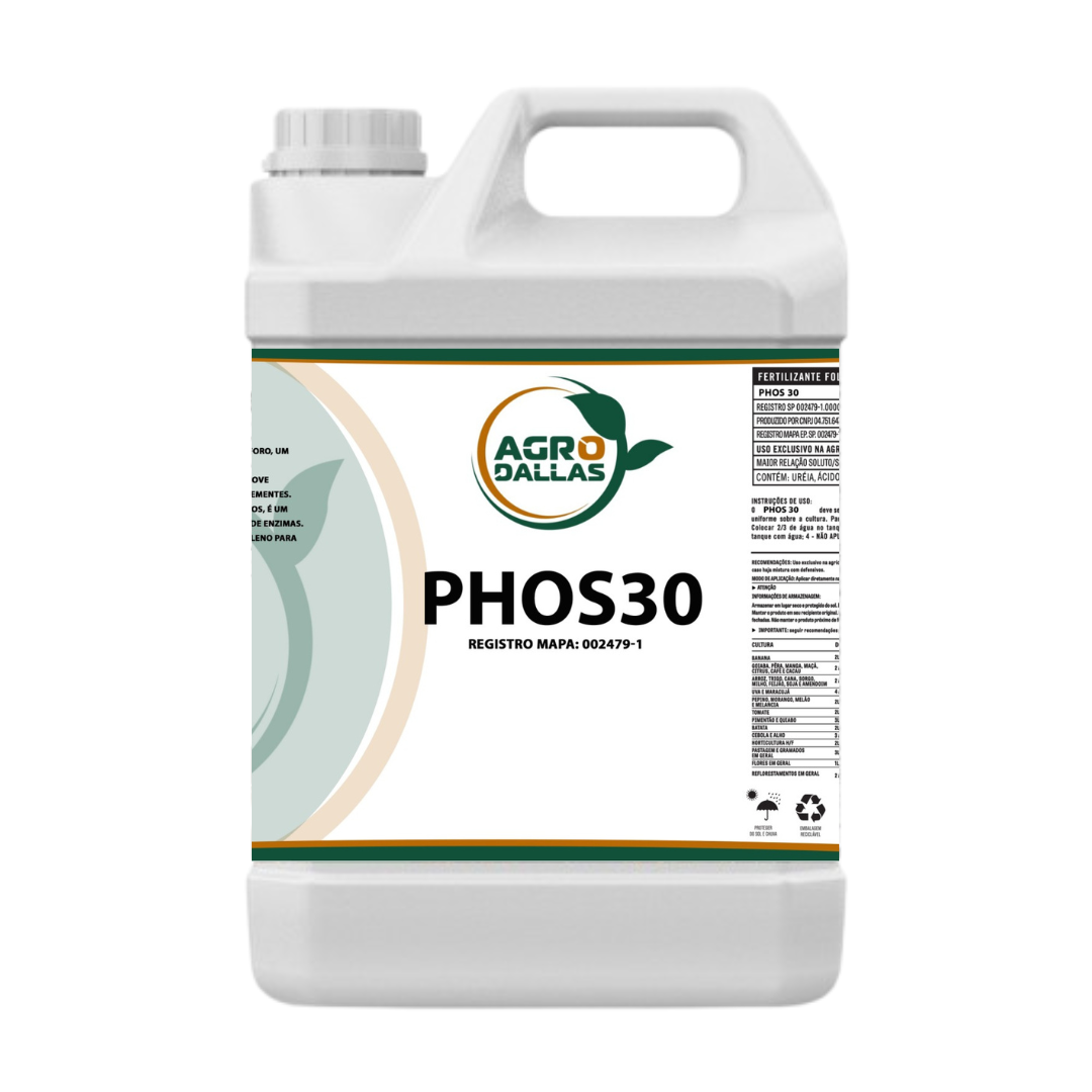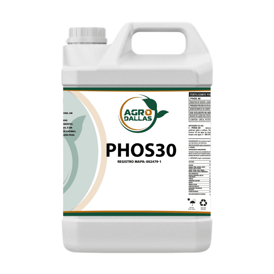 O PHOS 30 Agro Dallas é um fertilizante mineral simples em solução, desenvolvido para fornecer um aporte concentrado e altamente assimilável de Fósforo (P₂O₅). Com 30% de Fósforo solúvel em água, à base de Ácido Fosfórico, o PHOS 30 atua como o principal fornecedor de energia da planta.
